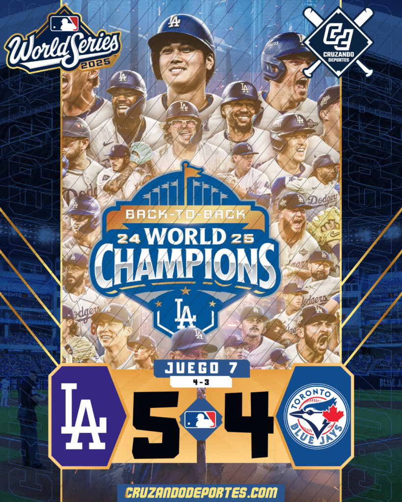 Los Dodgers lo volvieron a hacer. En un Juego 7 digno de película, Los Ángeles derrotó 5-4 a los Azulejos de Toronto en extra innings para retener el título de la Serie Mundial 2025. El héroe de la noche fue Will Smith, quien conectó un jonrón solitario en la entrada 11 ante Shane Bieber para […]