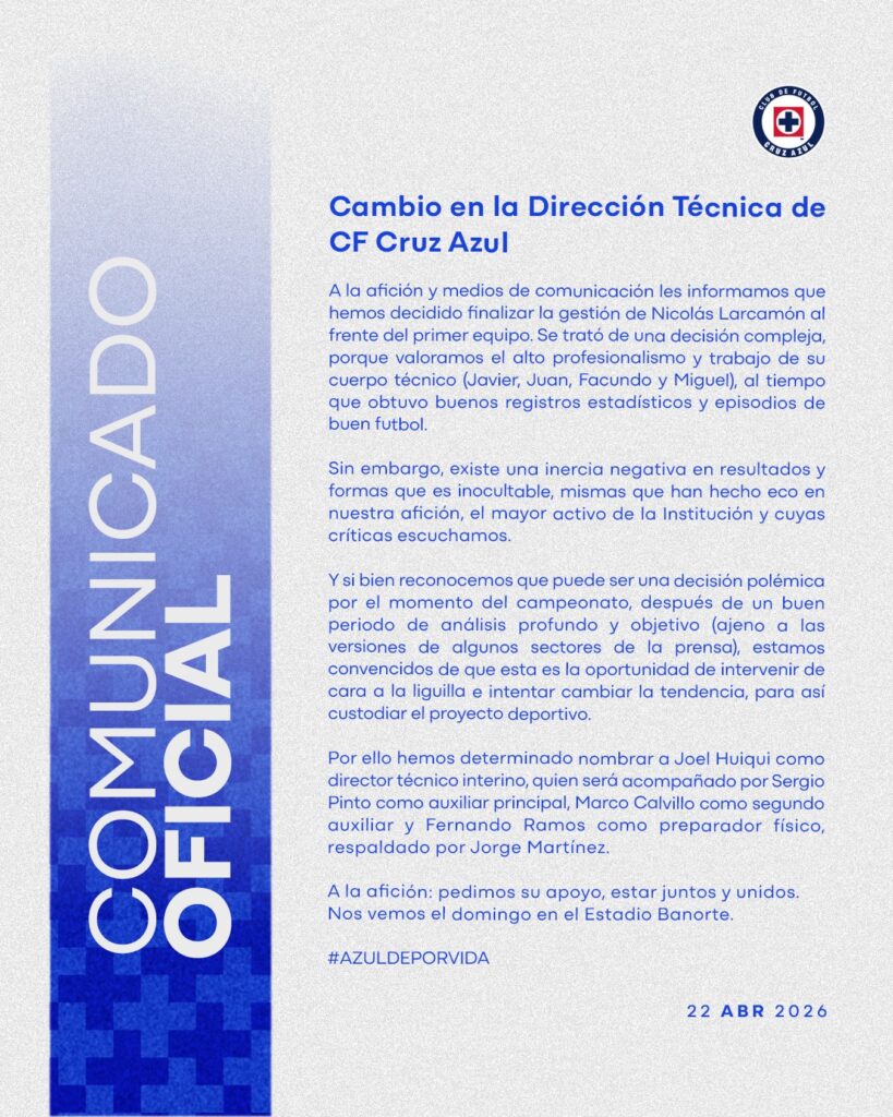 El Cruz Azul anunció de manera oficial la salida de Nicolás Larcamón como director técnico del primer equipo, tras una evaluación interna derivada de los resultados recientes en el Clausura 2026.