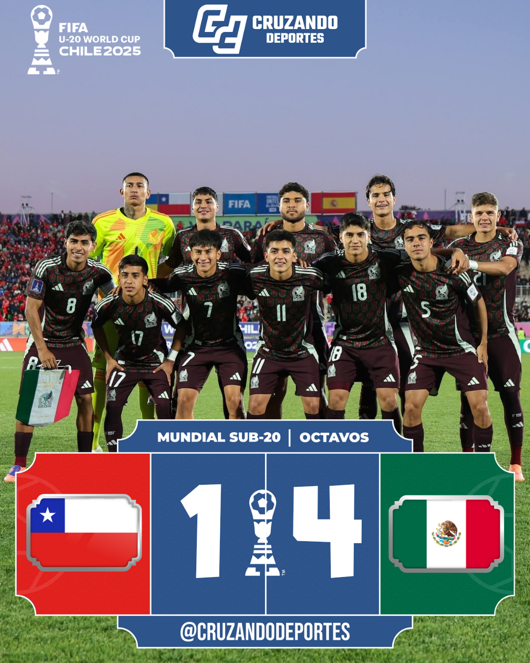 La selección mexicana Sub-20 confirmó su buen momento en el Mundial de Chile al vencer 4-1 a la anfitriona, asegurando su pase a los cuartos de final y manteniendo el invicto en el torneo.