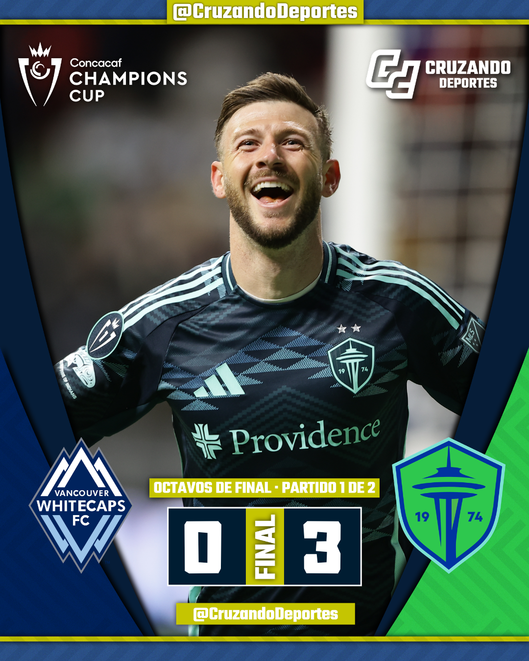 Seattle Sounders FC dio un paso importante rumbo a los Cuartos de Final de la Concacaf Champions Cup tras vencer 3-0 a Vancouver Whitecaps FC en el partido de ida de los Octavos de Final disputado en el BC Place de Canadá.