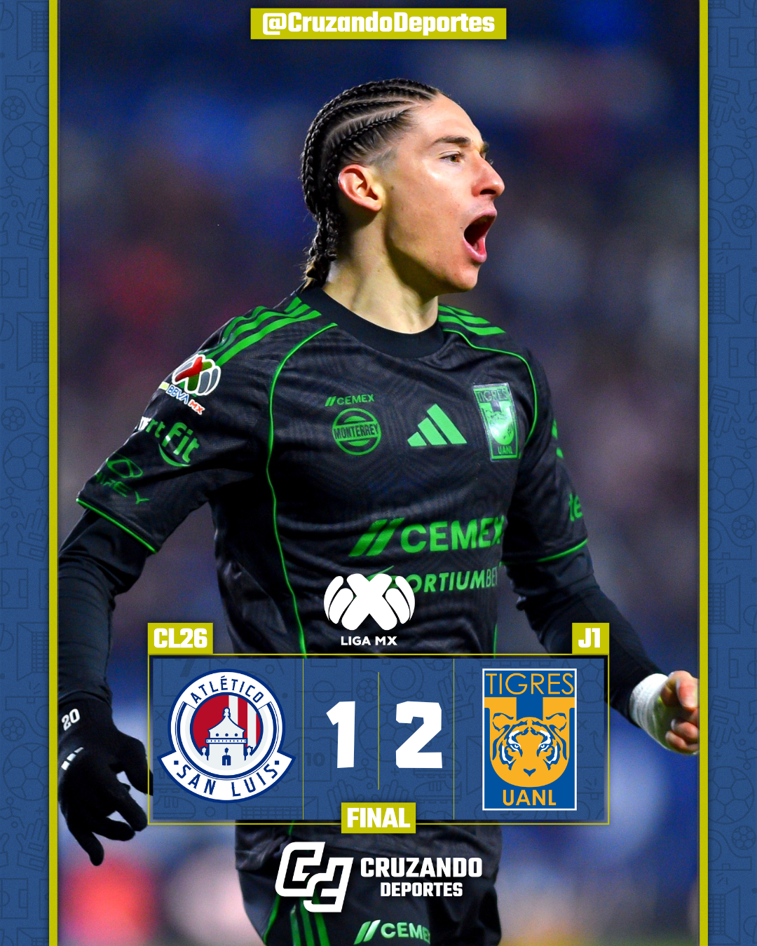 Tigres cerró la actividad de la Jornada 1 del Clausura 2026 con una victoria importante como visitante al imponerse 2-1 al Atlético de San Luis en el Estadio Alfonso Lastras. Un partido intenso, con momentos de presión local, pero que terminó inclinándose del lado felino.